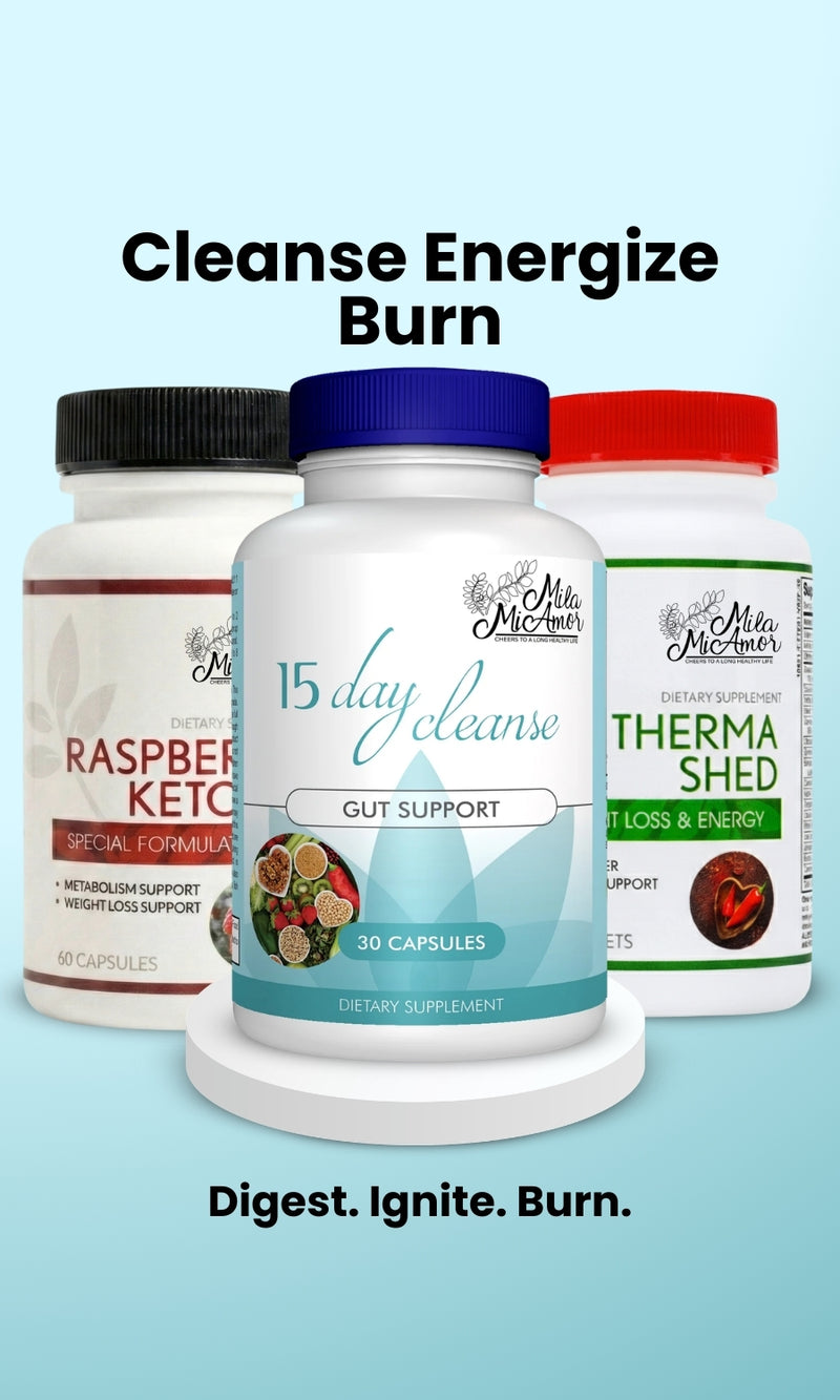 This bundle includes 15 Day Cleanse, Therma Shed, and Raspberry Ketone, designed to support digestive cleansing, metabolism, and energy.