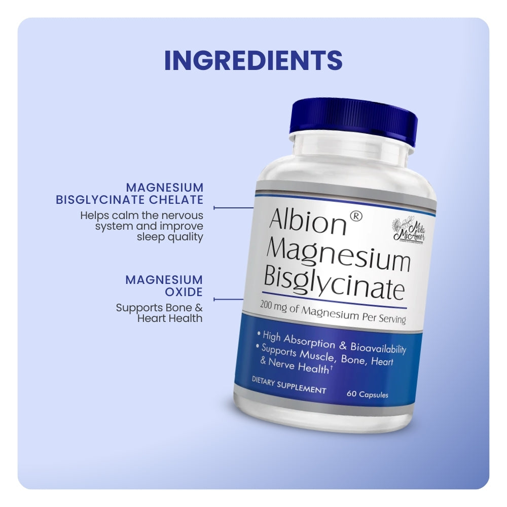 Bisglicinato de magnesio — La forma más biodisponible de magnesio; calma el sistema nervioso, mejora la calidad del sueño y favorece el rendimiento muscular y cognitivo.