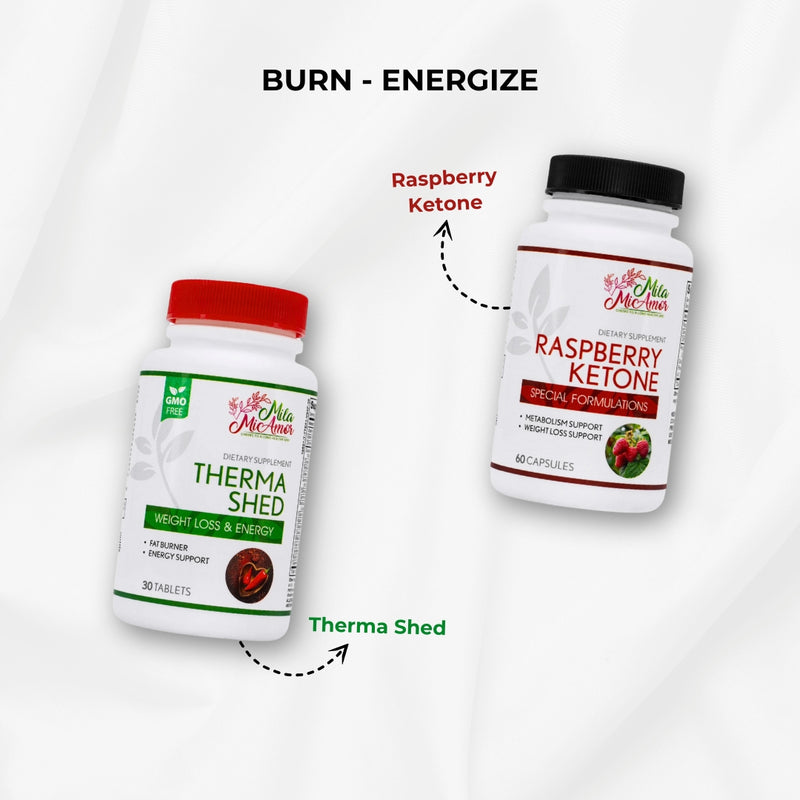 Meet the dynamic duo - Therma Shed and Raspberry Ketone. This Burn & Energize Bundle combines the natural power of thermogenesis and fat-burning to help you reach your body transformation goals. It is the best metabolism booster for weight loss.